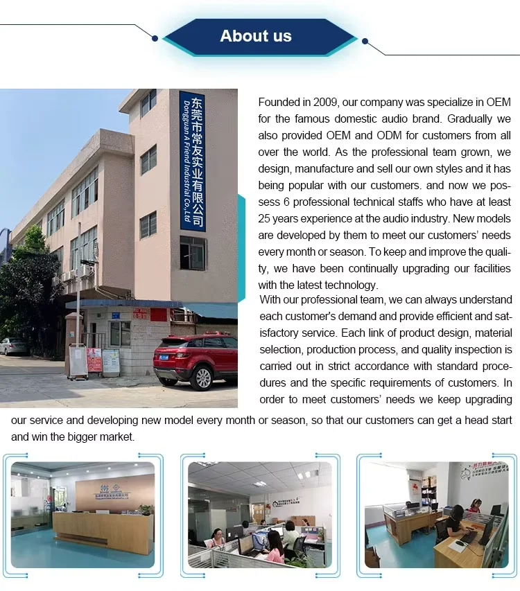 Founded in 2009,our company was specialize in OEM for the famous domestic audio brand. Gradually we also provided OEM and ODM for customers from all over the world.As the professional team grown, we design, manufacture and sell our own styles and it has being popular with our customers. and now we possess 6 professional technical staffs who have at least 25 years experience at the audio industry.New models are developed by them to meet our customers' needs every month or season.To keep and improve the quality,we have been continually upgrading our facilities with the latest technology.